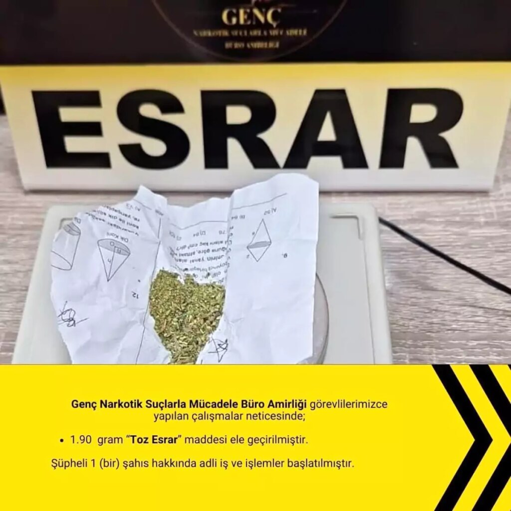 Bingöl'ün Genç ilçesinde yapılan polis operasyonunda 1,90 gram toz esrar ele geçirildi. Bir kuşkulu hakkında isimli süreç başlatıldı.