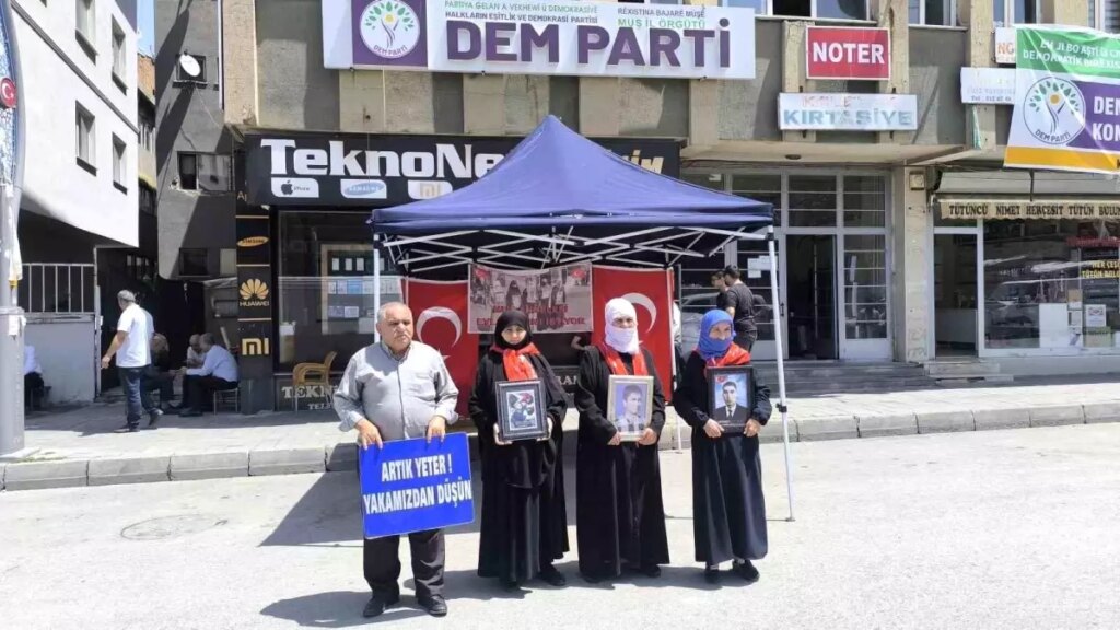 Muş’ta çocukları terör örgütü PKK tarafından kaçırılan aileler, DEM Parti Vilayet Başkanlığı binası önünde hareketlerine devam ediyor. Her hafta çarşamba günü DEM Parti binası önünde bir ortaya gelen aileler, evlatlarına kavuşacakları günü umutla bekliyor. PKK’nın silah bırakmasını ve “Terörsüz Türkiye” sürecini memnuniyetle karşılayan aileler, aksiyon boyunca fotoğraflarını taşıdıkları çocuklarına “teslim ol” davetinde bulundu.