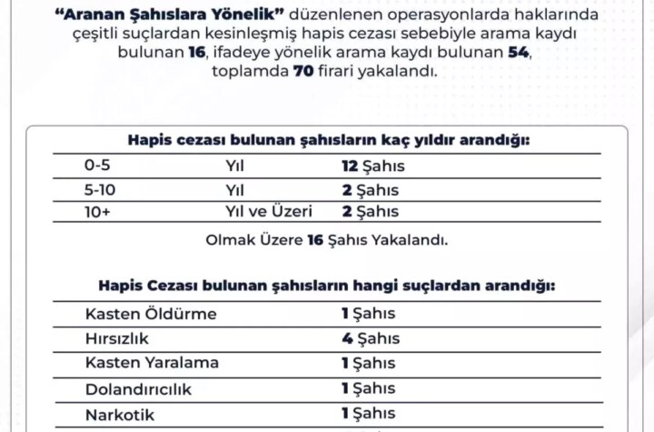 Bingöl'de emniyet ve jandarma takımlarınca gerçekleştirilen operasyonlarda, çeşitli cürümlerden aranan toplam 70 şahıs yakalandı....